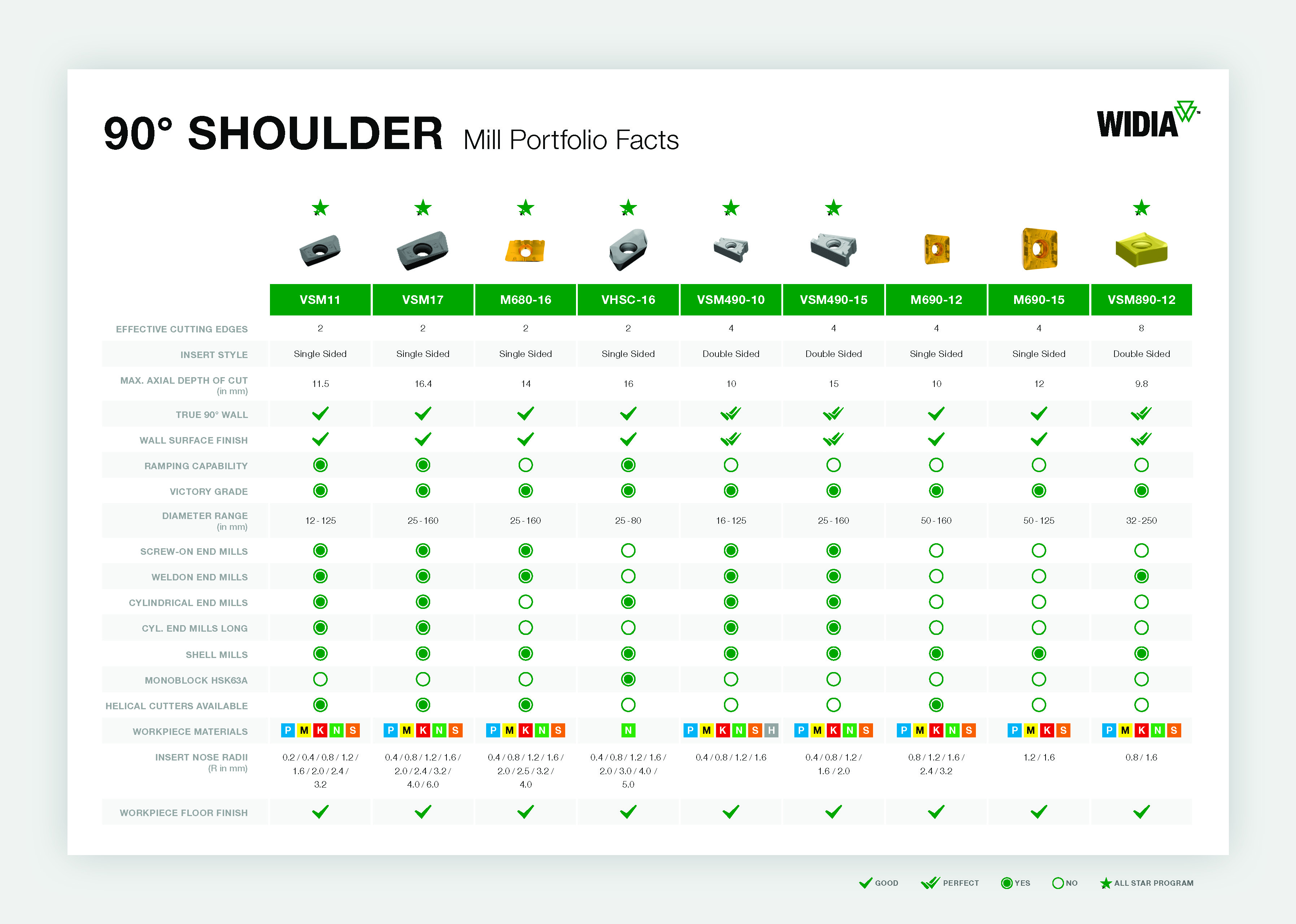 Get the Facts on Your 90° Shoulder Mills Learn more about the WIDIA portfolio of 90° shoulder mills. Download this fact sheet to review effective cutting edges, insert styles, diameter range and more.